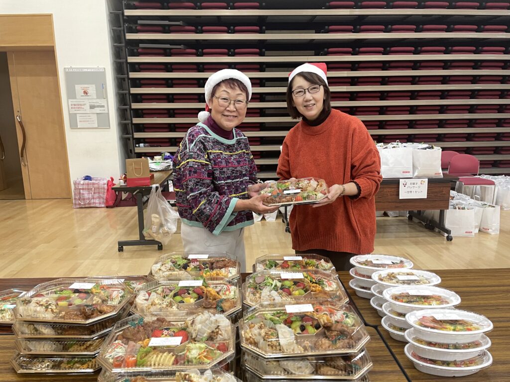 完成したオードブル(それにパスタ、またはパエリアがセットでつきます)はクリスマスギフトの配布会場に運ばれ、集まった多くのボランティアのみなさまによって風呂敷にしっかりと包まれていました。このほかにも、お菓子やクリスマスケーキなどが寄贈され、受け取りにいらしたみなさんの歓声が今年もあちこちで聴かれていました。このクラウドファンディングを応援いただきましたみなさまに、心から御礼を申し上げます。この後も、ネクストゴールの事業についてご報告させていただきましたが、まずは目標達成のお礼を一言申し上げます。